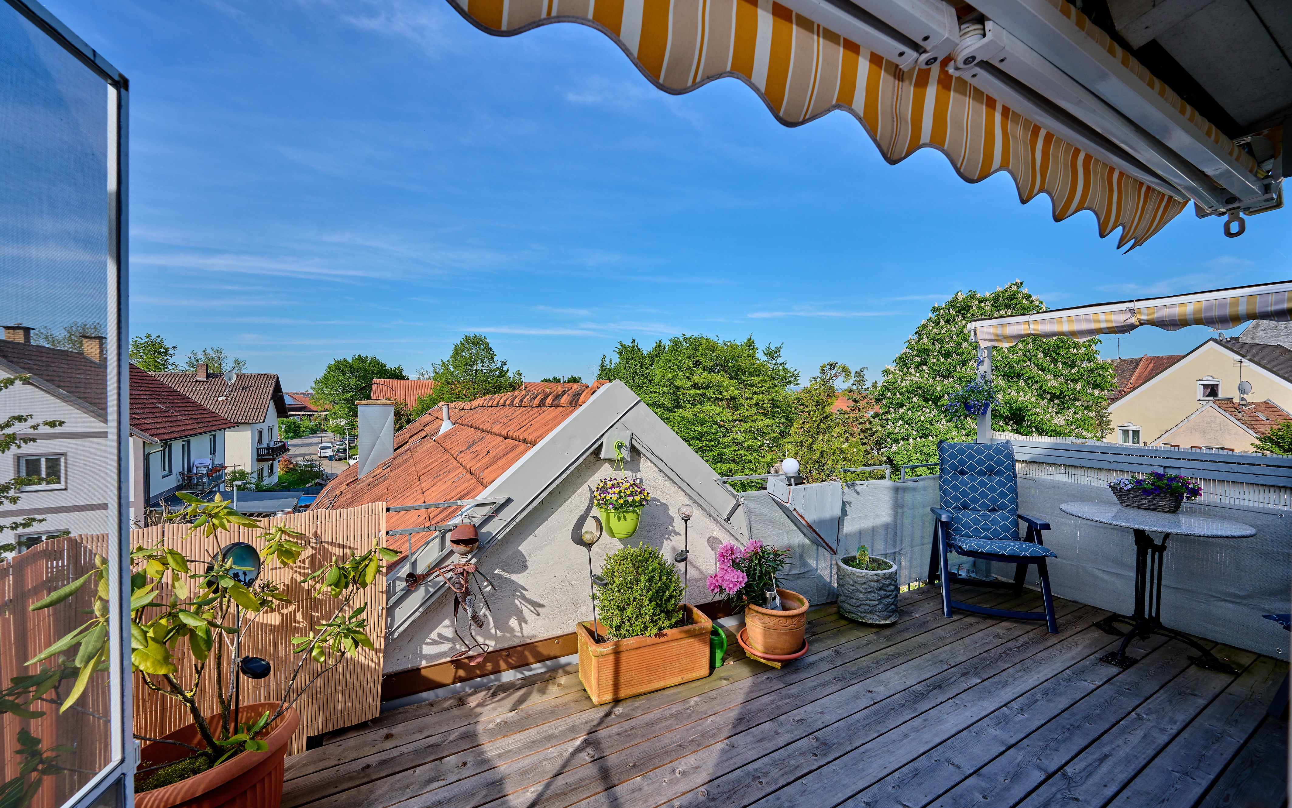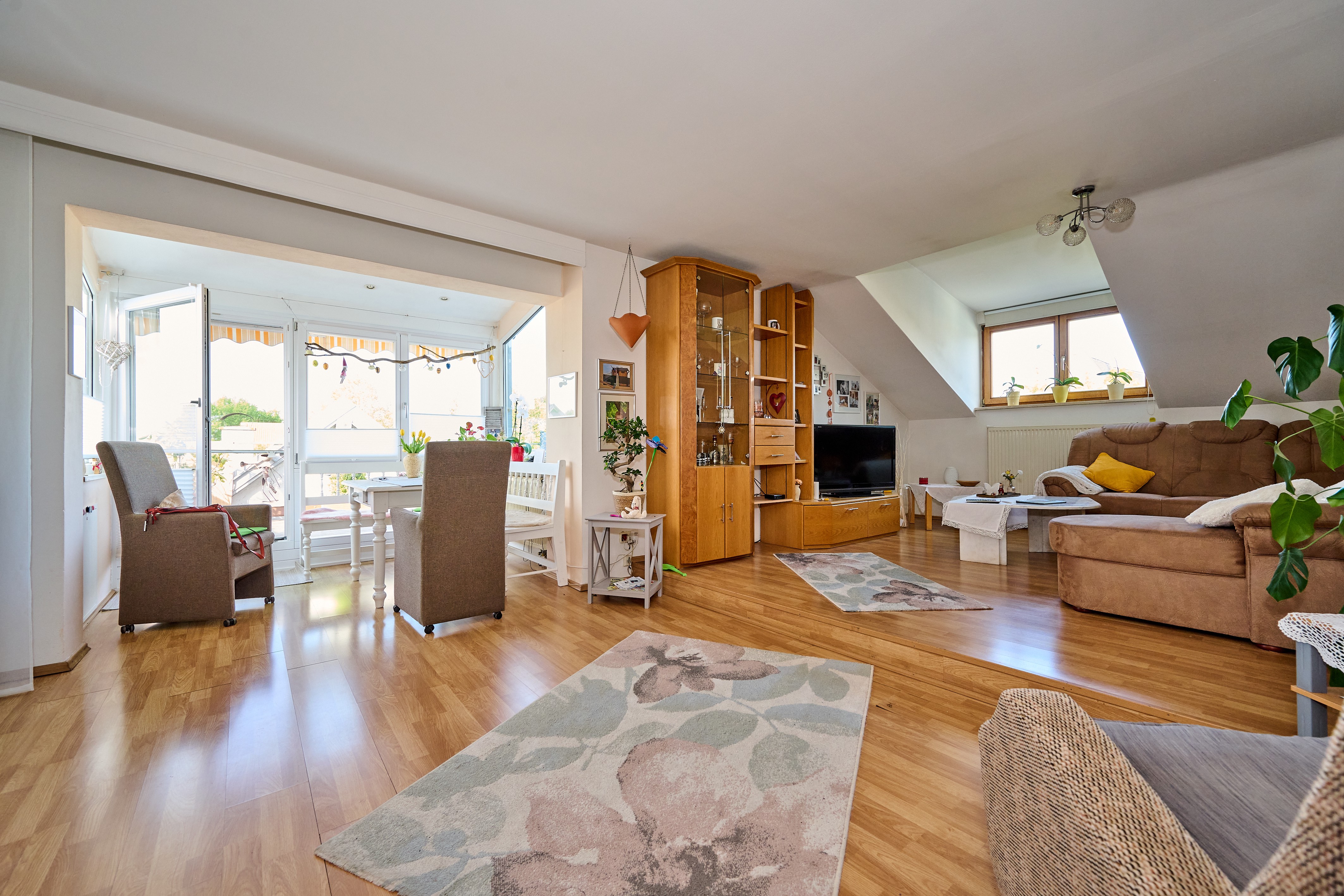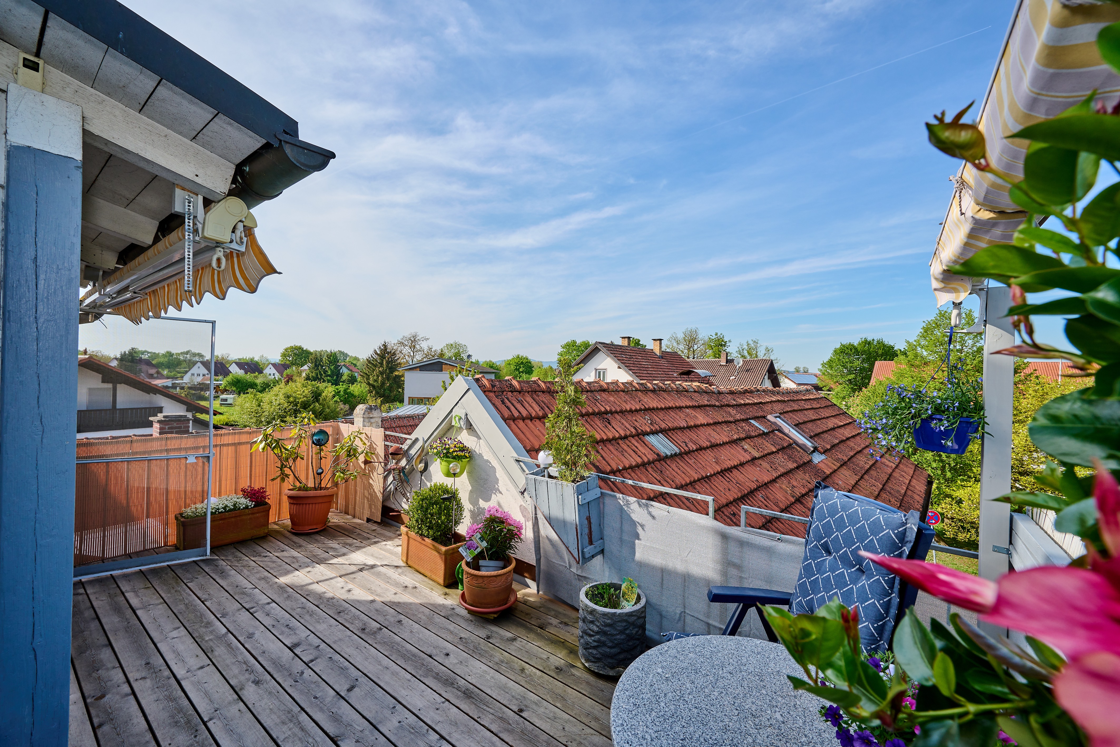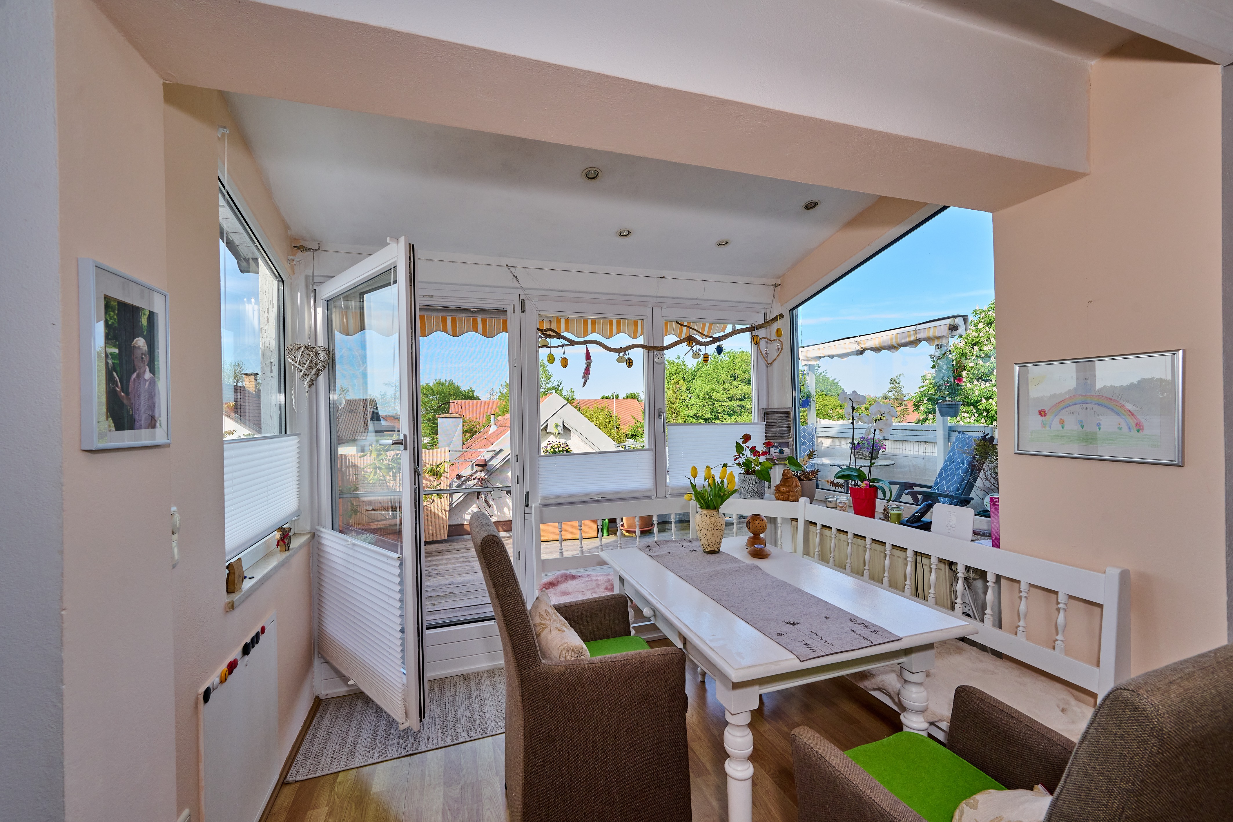 Angrenzend an den Wohnbereich befindet sich der offene lichtdurchflutete Wintergarten, der zum Entspannen einlädt. Von hier aus haben Sie direkten Zugang zur frisch sanierten Dachterrasse, auf der Sie bei einem Glas Wein den Tag ausklingen lassen können, während Sie die Aussicht genießen.