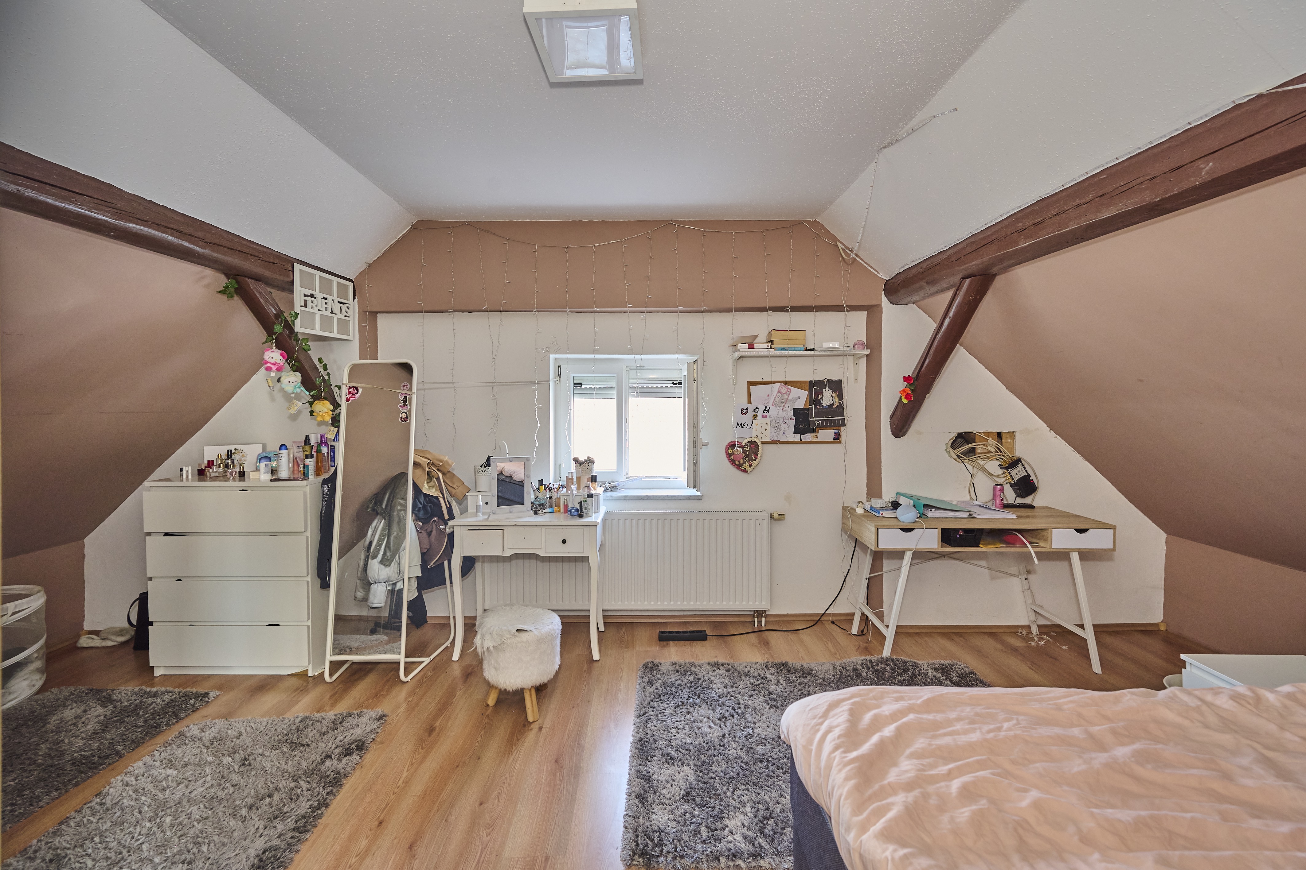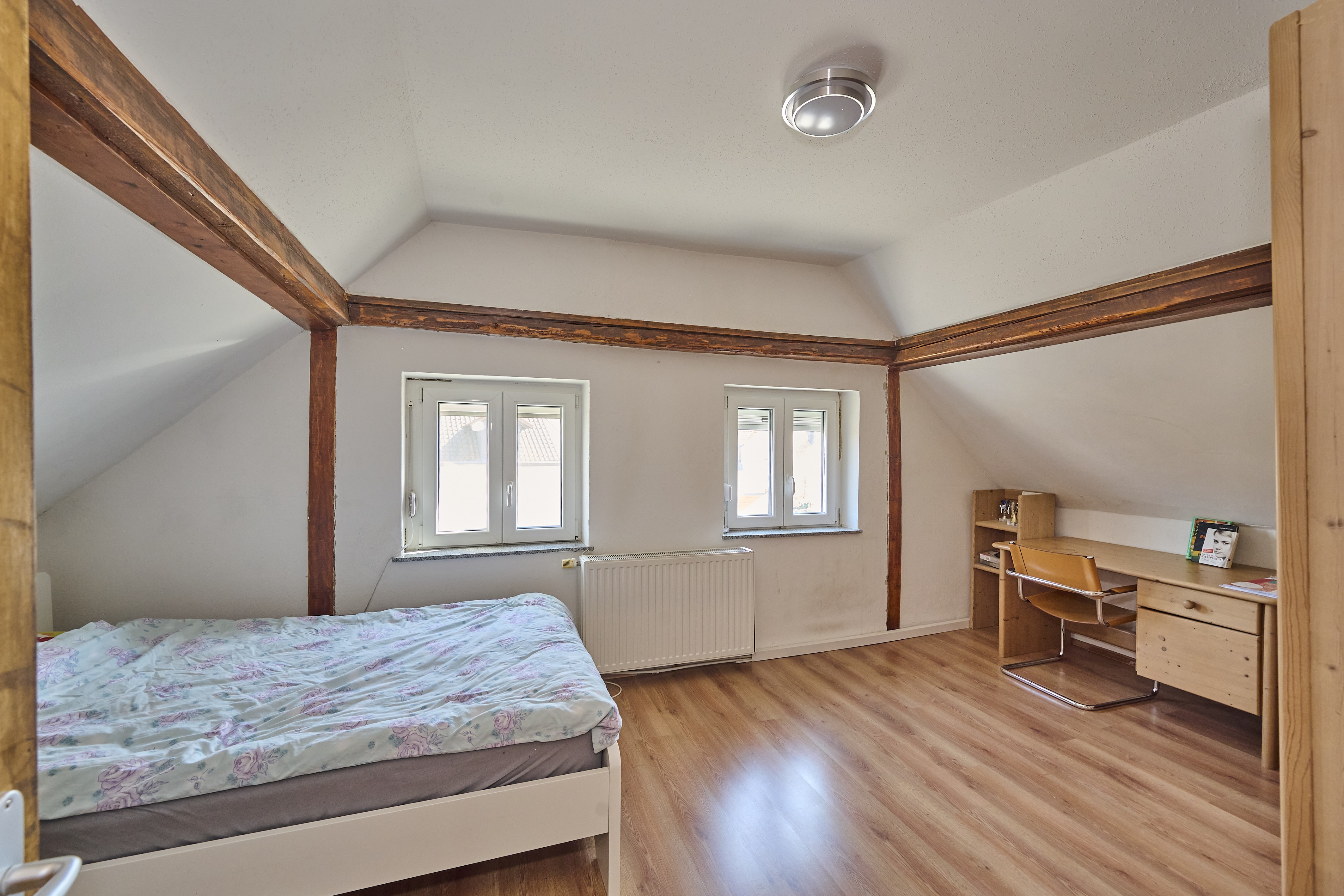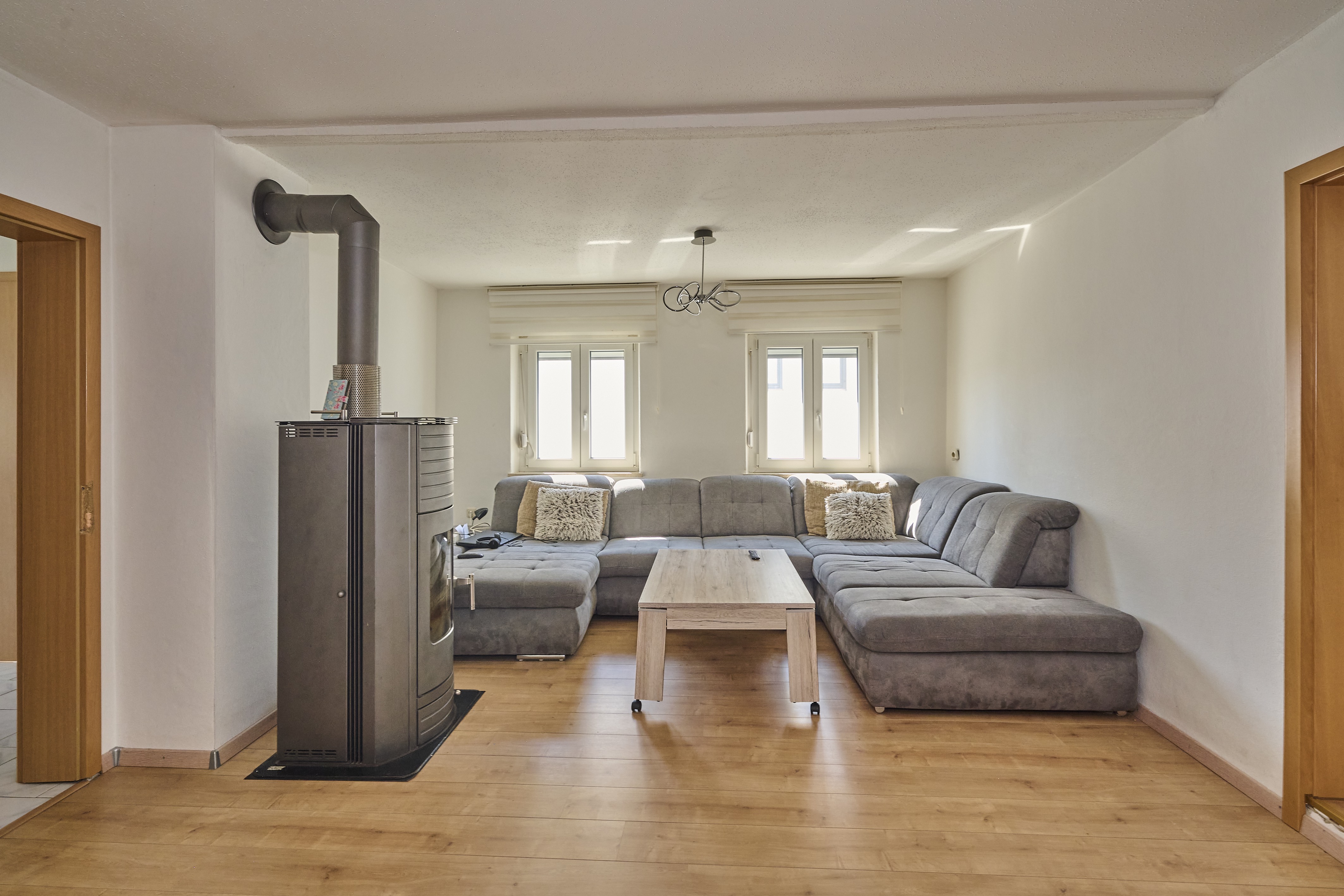 Im ersten Obergeschoss erwarten Sie ein weiteres Tageslichtbadezimmer mit Dusche, WC und Waschbecken, sowie eine geräumige Küche inklusive neuwertiger Einbauküche und angrenzendem offenem Essbereich. Das große Wohnzimmer ist mit einem charmanten Kaminofen ausgestattet und bietet einen gemütlichen Ort, um sich zu entspannen. Weiter geht es in ein Durchgangskinderzimmer oder Büro, gefolgt von einem sehr geräumigen Schlafzimmer mit ausreichend Platz für Bett, Schrank und weitere Möbelstücke. Im zweiten Obergeschoss finden Sie zwei weitere Kinderzimmer, die ähnlich groß sind und einen ausreichenden Platz für Ihre Familie bieten.