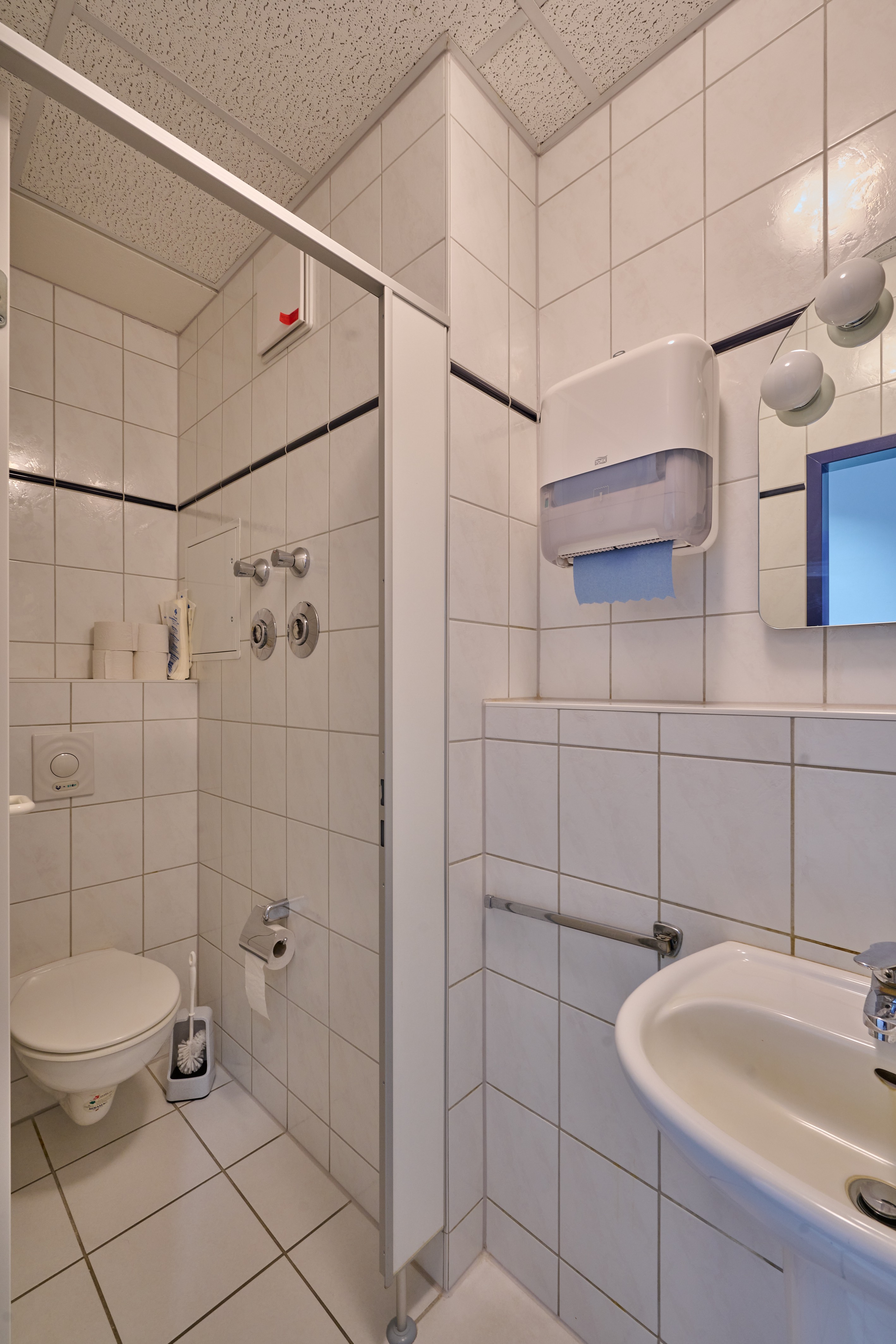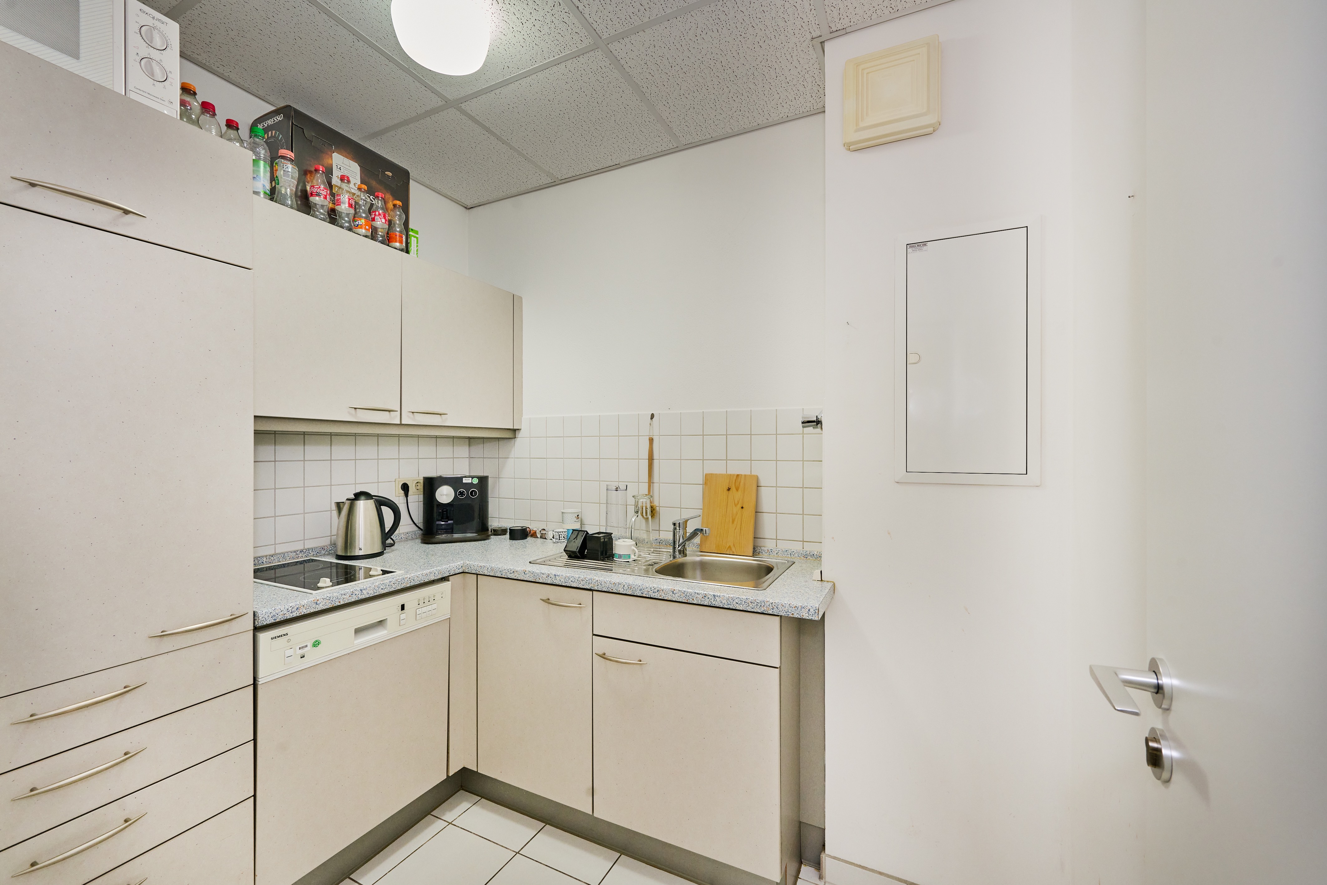 Zusätzlich verfügt die Einheit am Ende des Flurs über eine voll ausgestattete Küche. Auf der linken Seite des Flurs befindet sich ein WC-Bereich mit zwei gegenüberliegenden Toiletten und einem Waschbecken in der Mitte. Die gesamte Einheit ist in einem gepflegten Zustand und besticht durch ihre Großzügigkeit und Helligkeit.