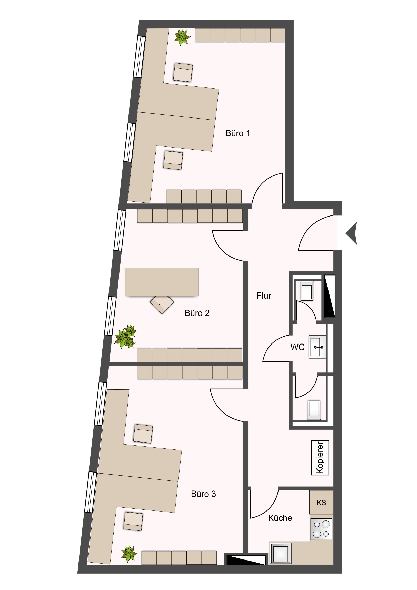 Die Einheit im ersten Obergeschoss besteht aus drei großzügigen Büroräumen mit jeweils 21 m², 22 m² und 15 m² Fläche, die alle mit zwei großen Fenstern ausgestattet sind und somit eine angenehme Arbeitsatmosphäre bieten.
