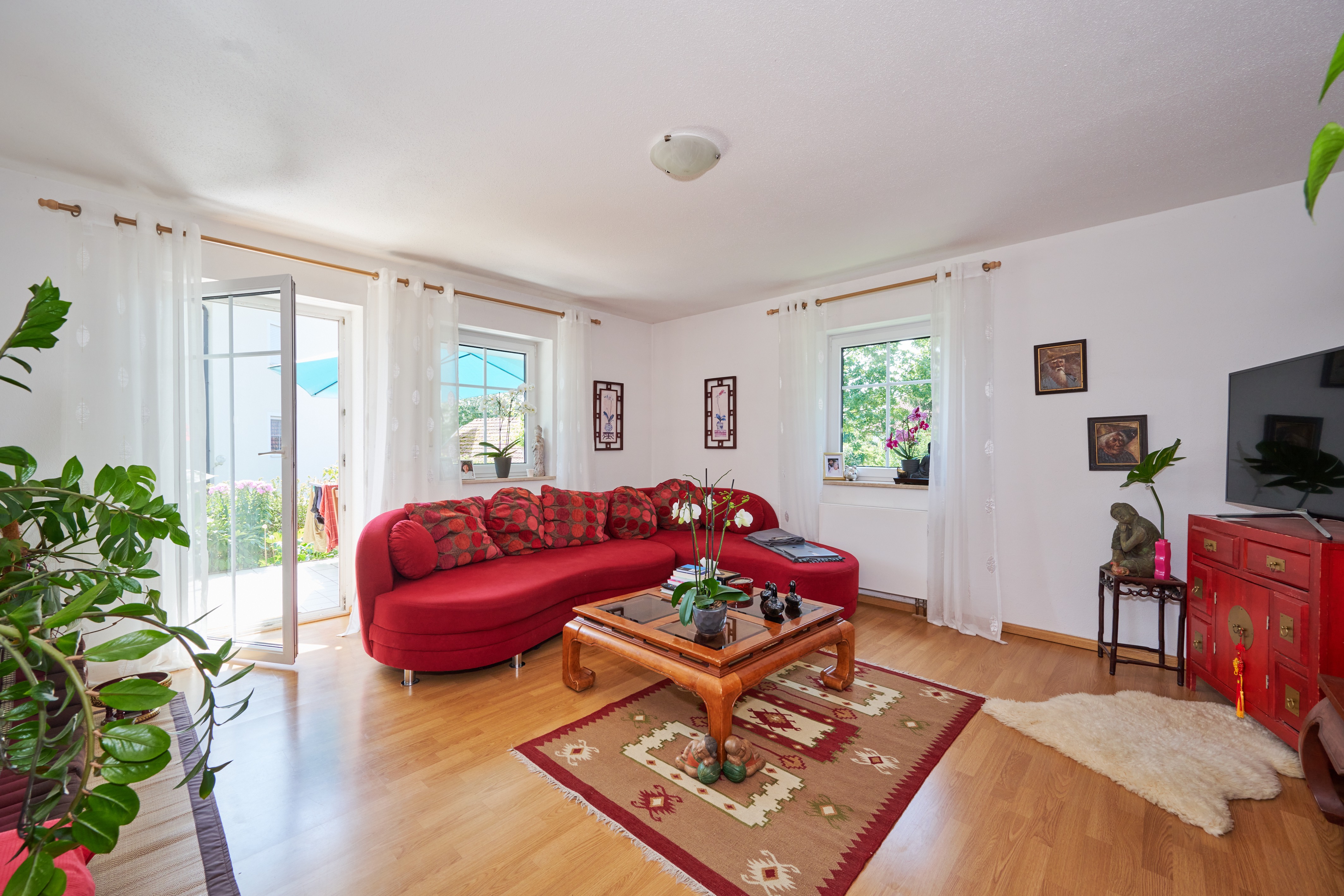 Wohnzimmer: Ein großzügiges und lichtdurchflutetes Wohnzimmer bietet ausreichend Platz zum Entspannen und überzeugt durch den direkten Zugang zur traumhaften Terrasse.