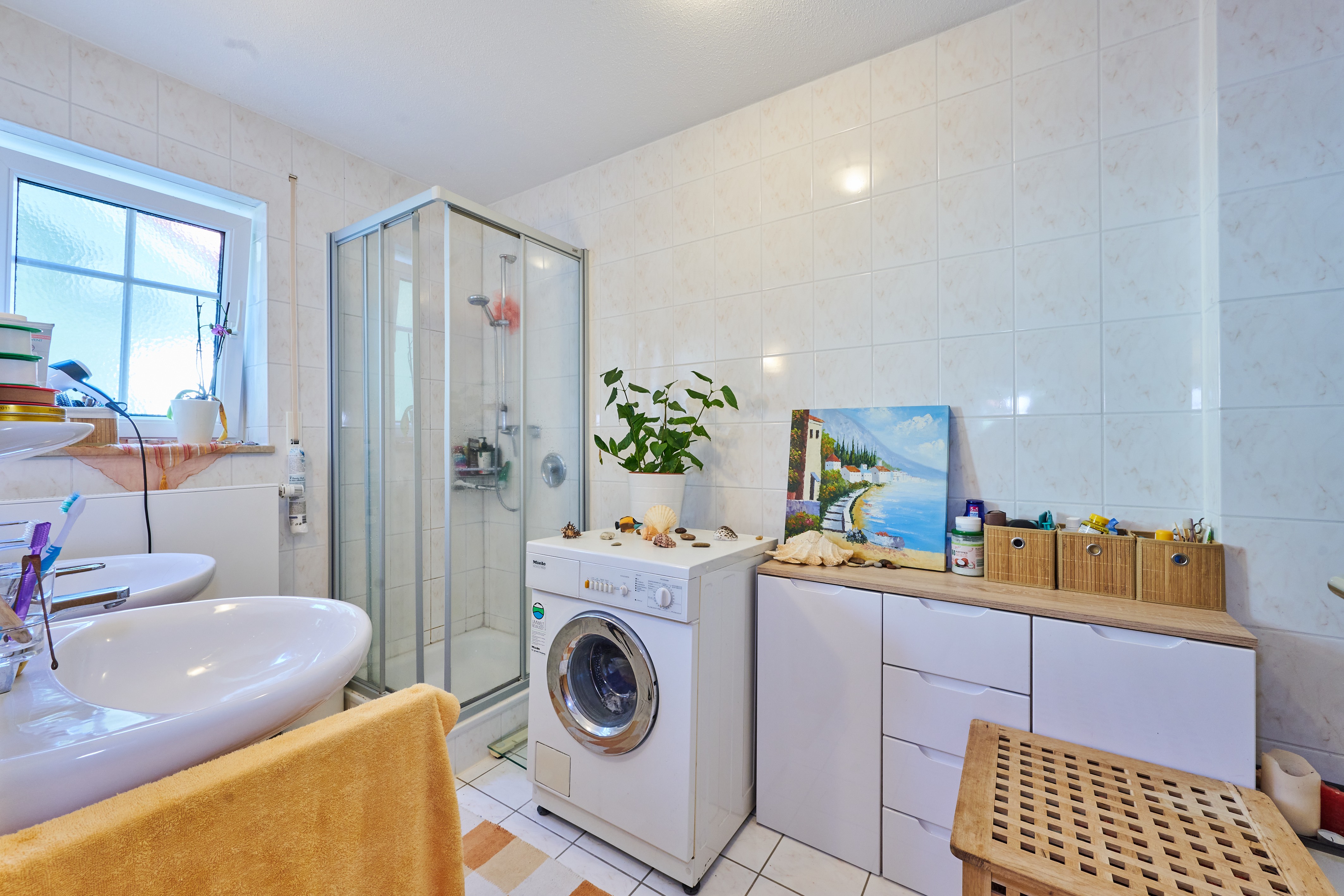 Badezimmer: Das Badezimmer überzeugt durch ein Fenster, das für Tageslicht und Frischluft sorgt. Ausgestattet mit Badewanne, Dusche und einem Waschmaschinenanschluss, lässt es keine Wünsche offen.