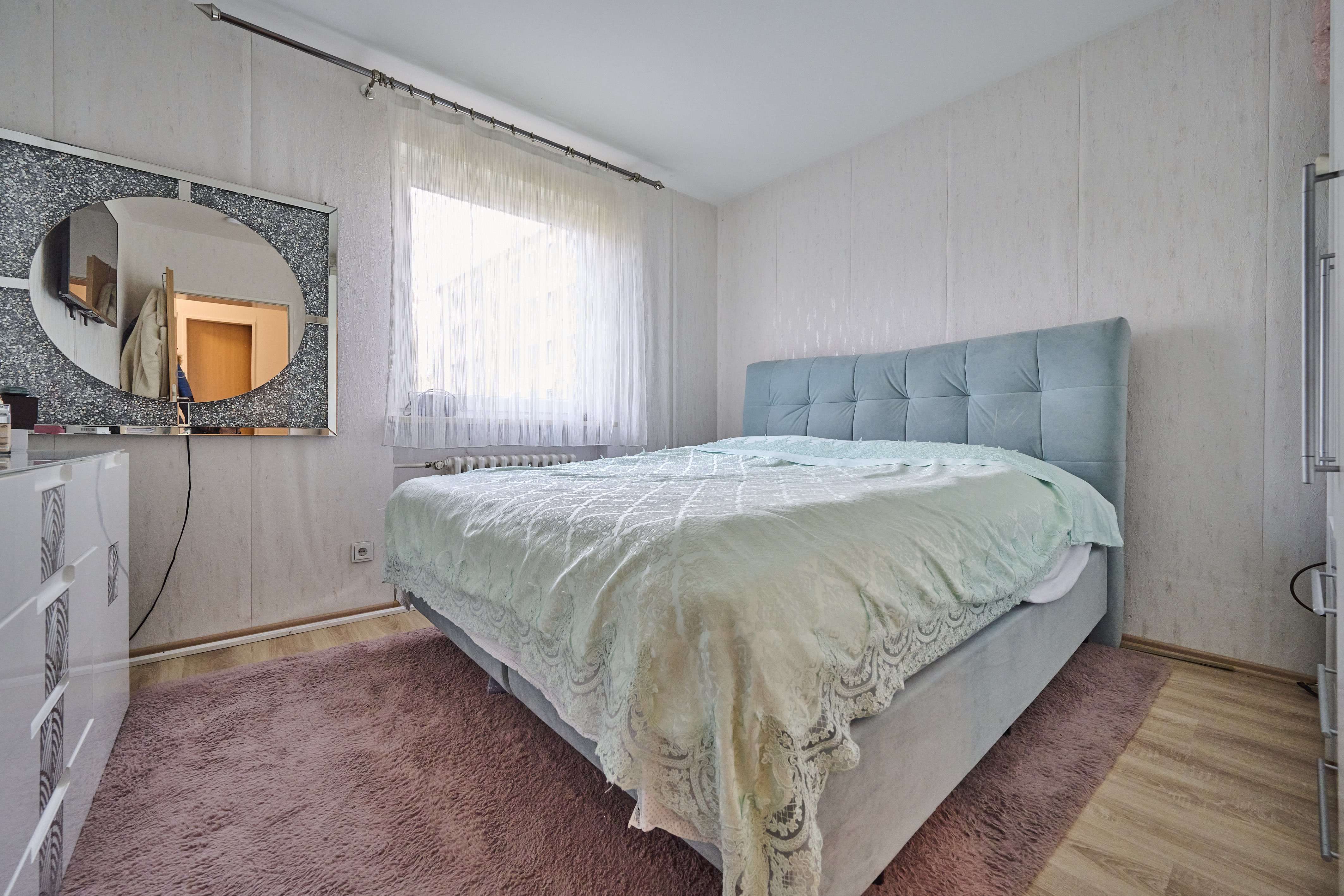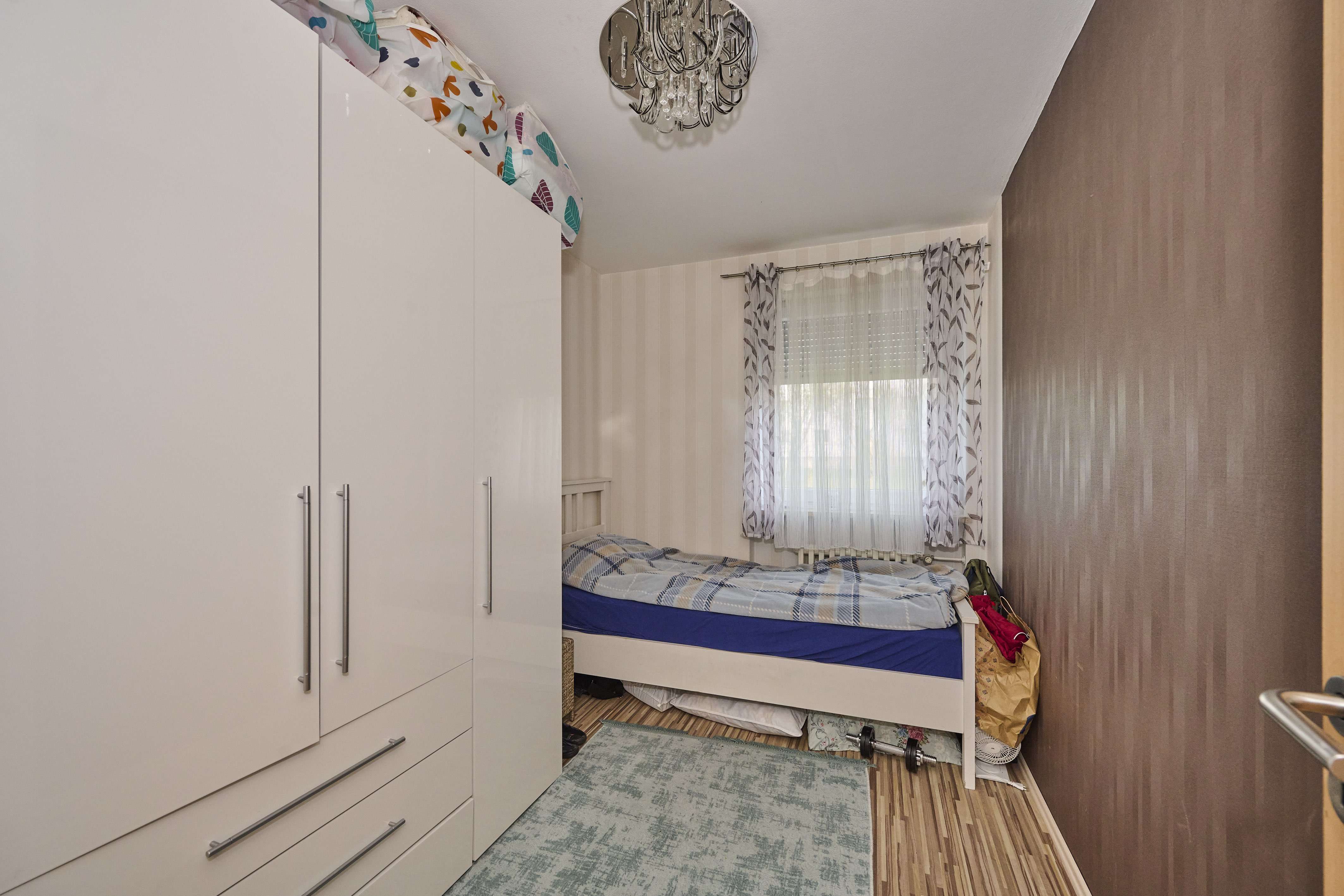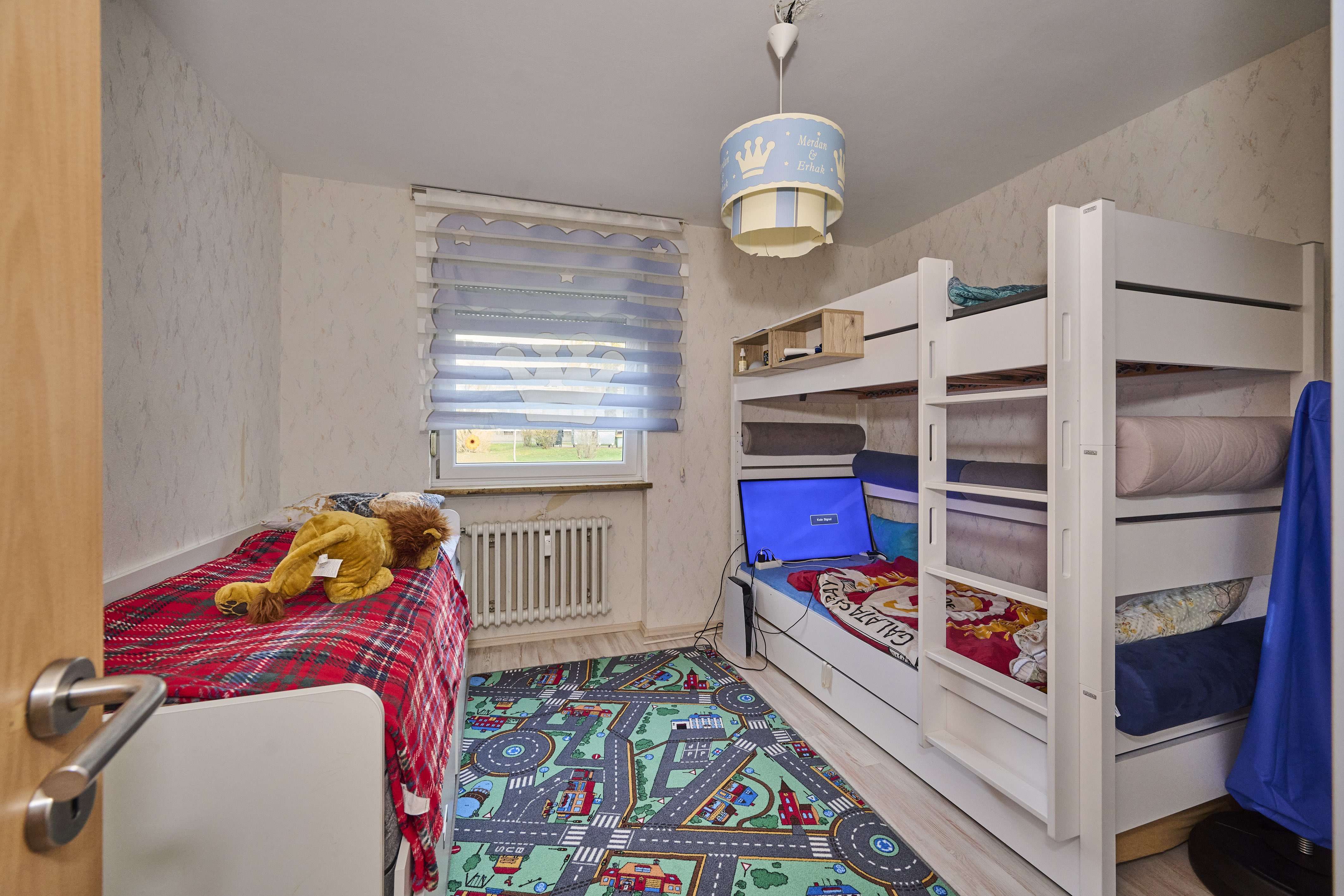 Die beiden weiteren Schlafzimmer der Wohnung sind geräumig und können individuell gestaltet werden. Das Elternschlafzimmer bietet genug Platz für ein großes Doppelbett sowie einen Schrank, während das zweite Kinderzimmer ideal als Gästezimmer, Büro oder Spielzimmer genutzt werden kann. Am Ende des Flurs befindet sich das tageslichtdurchflutete Badezimmer, welches 2018 komplett kernsaniert wurde und mit einer bodengleichen Dusche, einem Waschbecken und einer Toilette ausgestattet ist.